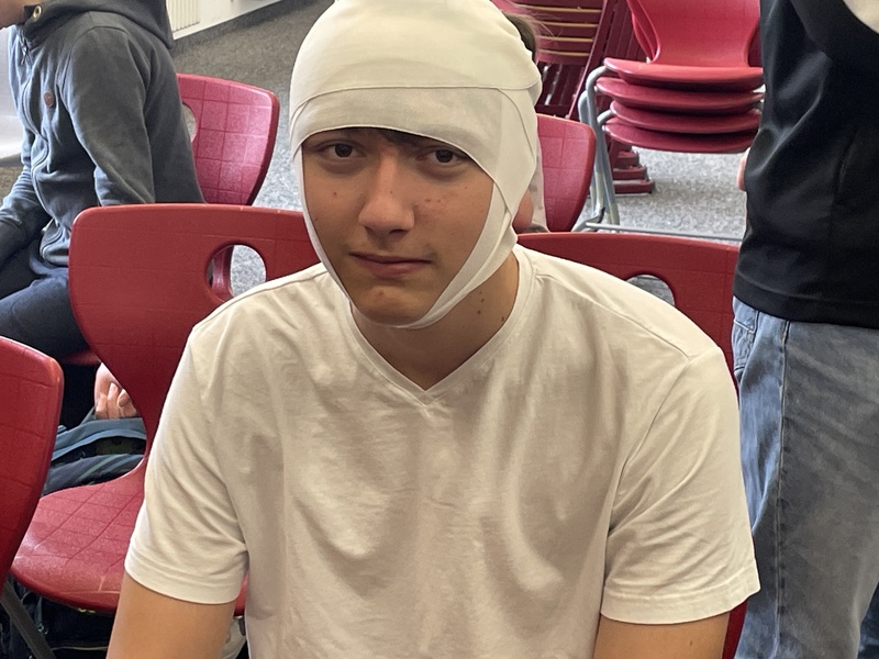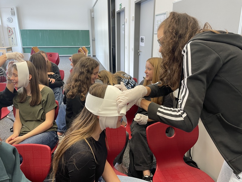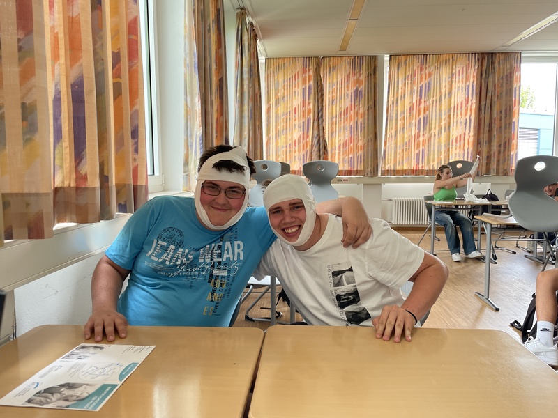 Zum Abschluss des Besuchs gab es eine praktische Einheit, in der die Schülerinnen und Schüler selbst Hand anlegen durften. Unter Anleitung der Fachkräfte des gKU Donau-Ries lernten sie, wie man einen Kopfverband richtig anlegt. Diese praktische Übung war nicht nur lehrreich, sondern auch eine willkommene Abwechslung vom theoretischen Teil der Veranstaltung. Die Jugendlichen hatten viel Spaß dabei und konnten ihre neu erworbenen Kenntnisse direkt anwenden.