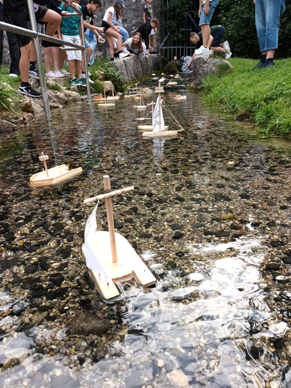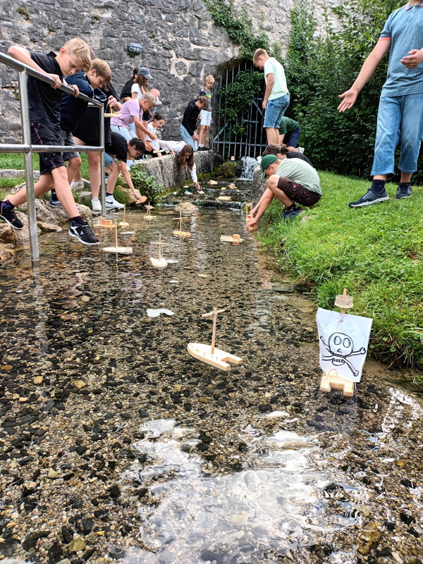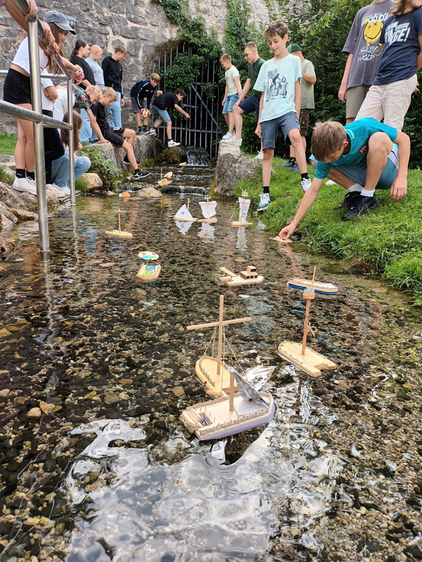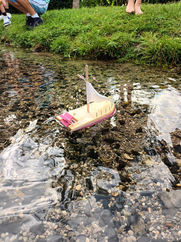 Neben dem Rumpf aus Holz durften sie ihre eigenen kreativen Ideen umsetzen. So wurde Draht gebogen, Segel wurden genäht und Liegestühle in Miniaturformat auf den Decks platziert. Natürlich durfte auch ein Antrieb nicht fehlen. Bei der anschließenden Ausfahrt am Bach konnten alle die Seetüchtigkeit ihres Boots testen.