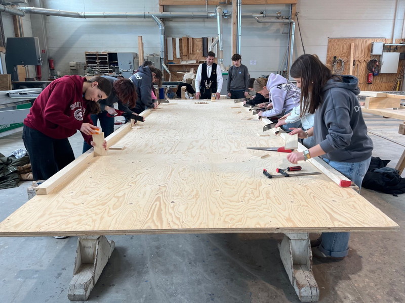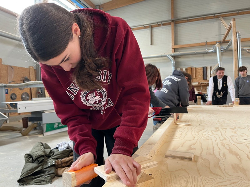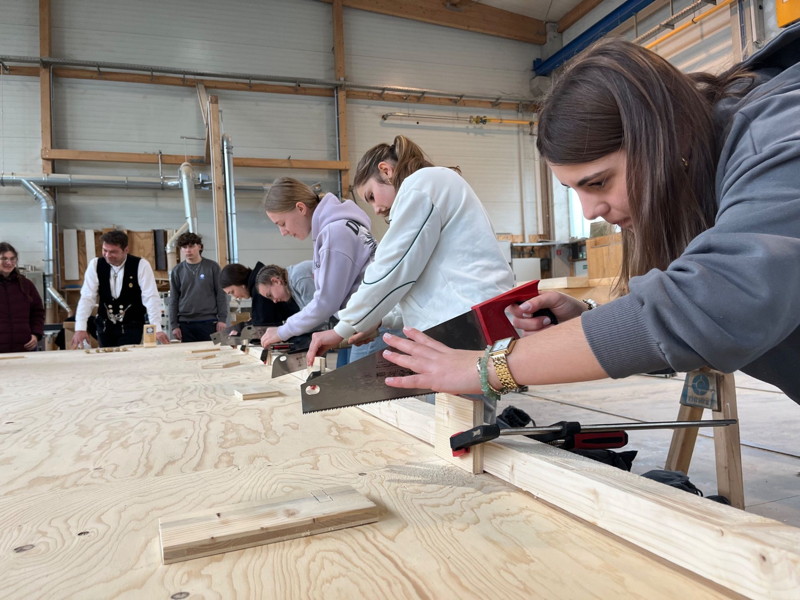 Eine weitere Station fand sich in der Zimmerei, wo die in Gruppen eingeteilten Schülerinnen und Schüler unter der Aufsicht des super-rücksichtsvollen Ausbildungsleiters und eines netten Azubis einen Handyhalter herstellen durften. Dass sie aus dem Werkunterricht bereits wussten, wie sie mit Säge und Stemmeisen umgehen mussten, kam ihnen dabei zugute. Daraufhin wurden in einer Halle kleine Schaltafeln nach Plan zu einer L-Schalung montiert, wobei die Arbeit im Team besonders wichtig war, und wofür vor allem die Mädchengruppe sehr gelobt wurde, da sie die Aufgabe in Rekordzeit erledigte.