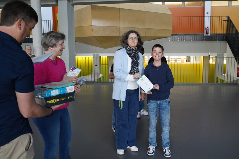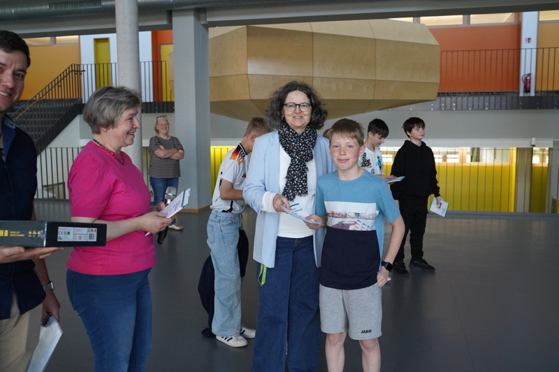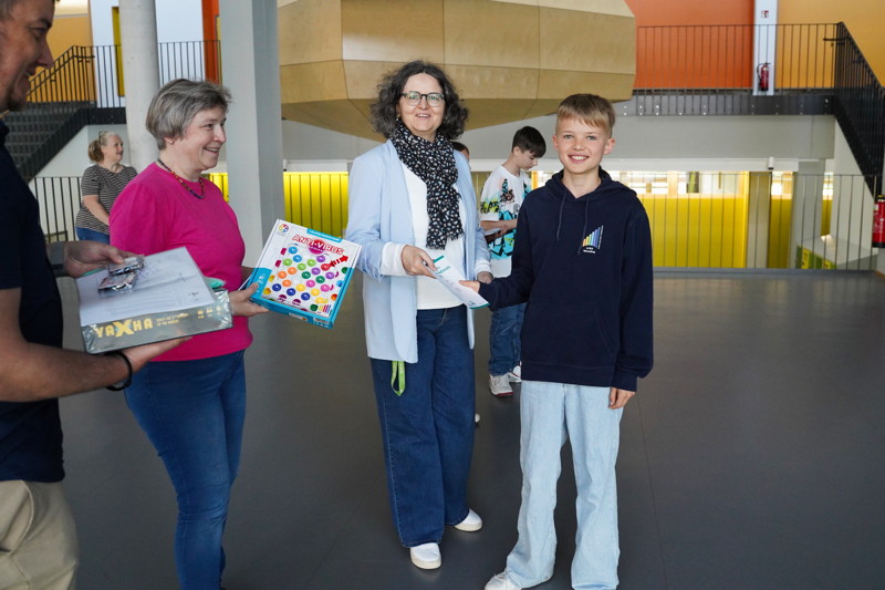 Zur Belohnung erhielten alle Teilnehmerinnen und Teilnehmer neben einer Urkunde als Erinnerungspreis ein kleines Spiel. Drei Schüler wurden für ihre herausragenden Leistungen mit größeren Spielen ausgezeichnet. So gewann Moritz Nuber mit über 100 von 120 Punkten einen 3. Preis. Jakob Resl erhielt nicht nur einen 2. Preis, sondern er wurde auch mit dem „Känguru“-T-Shirt 2025 belohnt, weil er den weitesten „Kängurusprung“ geschafft hatte, d.h. am meisten aufeinander folgende Aufgaben ohne Fehler gelöst hatte. Mit fast voller Punktzahl bekam schließlich Moritz Hofmann von Direktorin Frau Waschner-Probst einen 1. Preis verliehen. Diese Leistungen sind besonders hervorzuheben, zumal deutschlandweit nicht immer an jeder Schule ein Preis erzielt wird.